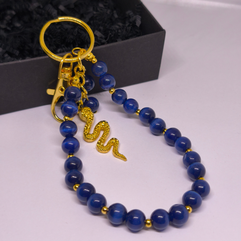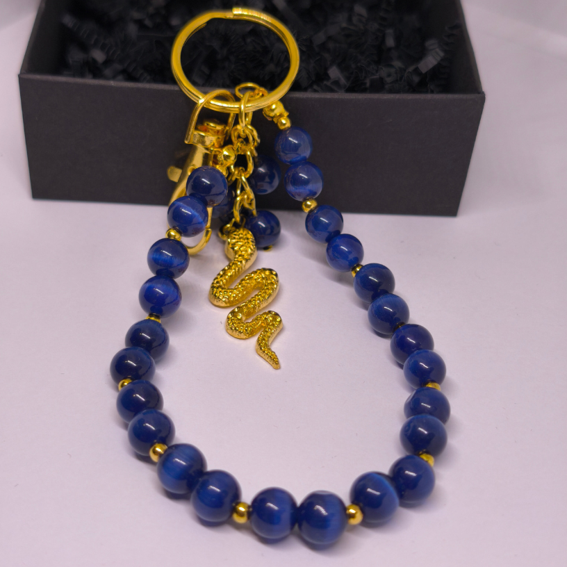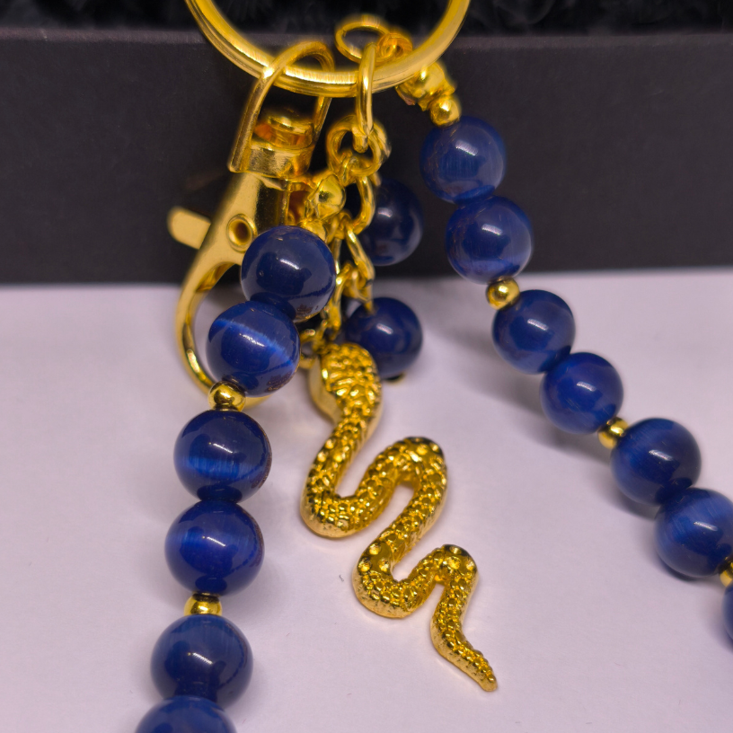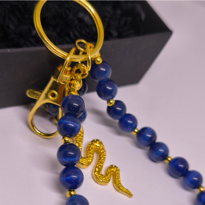 Atraskiet izcilu aksesuāru – rokas darbs somas un atslēgu piekariņš „Nakts čūska“. Šis elegants izstrādājums ir radīts, apvienojot zilus kaķa acs pērlītes, mirdzošas zeltainas detaļas un izteiksmīgu zeltainas krāsas čūskas formas piekariņu, kas simbolizē spēku, intuīciju un aizsardzību. ✨🐍