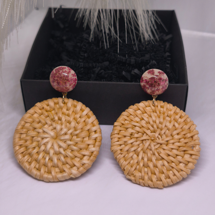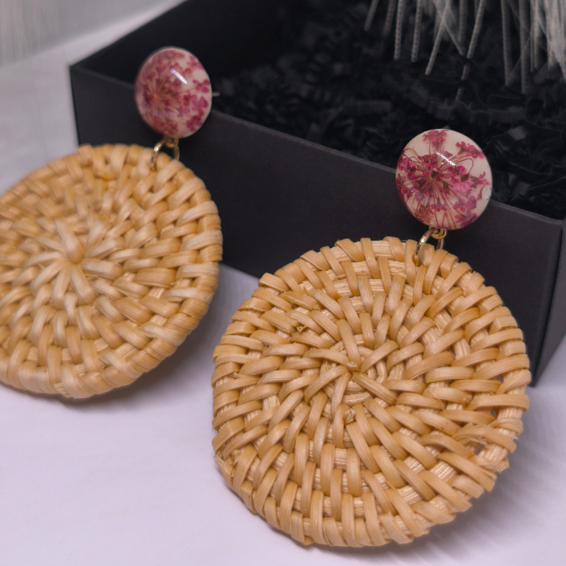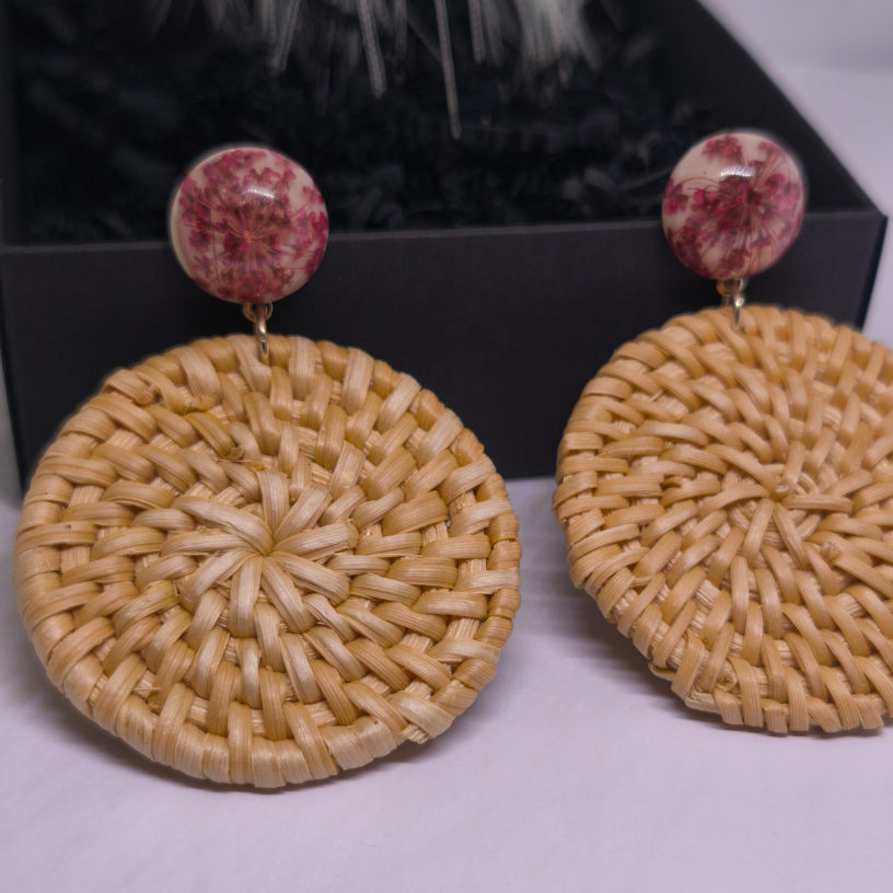 - Izgatavoti no pīta materiāla un sveķu detaļas ar ziedu motīvu 🌸