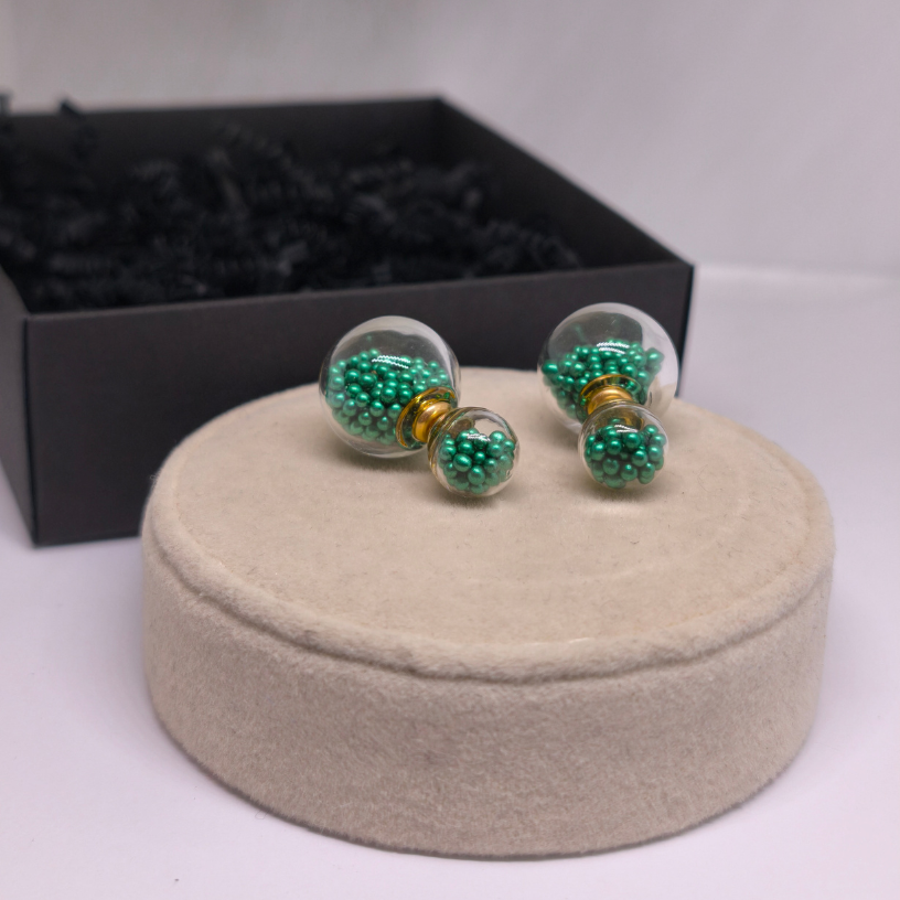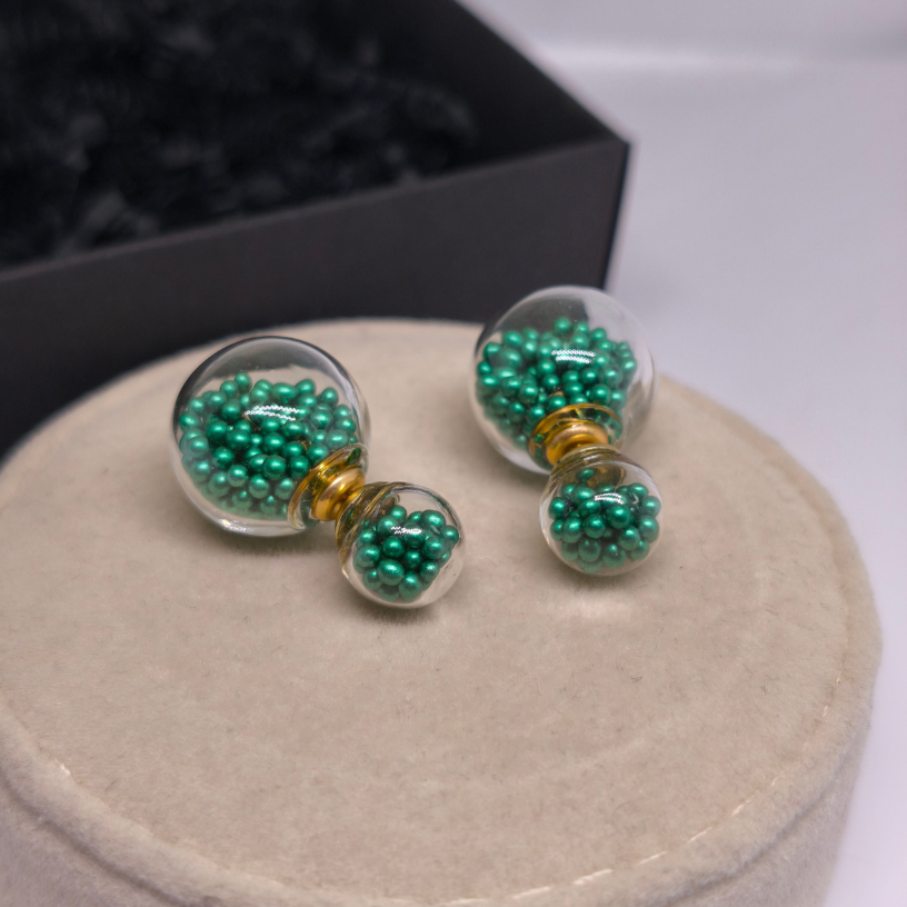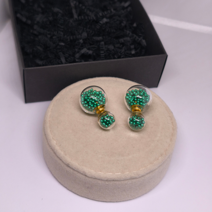 💫 Auskaru „Smaragda sapnis“ – tie ir unikāli dizaina rotaslietas, radītas sievietei, kura vēlas izskatīties smalki, bet iespaidīgi. Caurspīdīgais burbuļa formas dizains slēpj zaļus, smaragda toņa pērlītes, kas mirdz katrā solī.