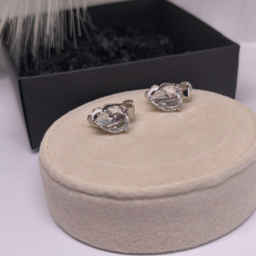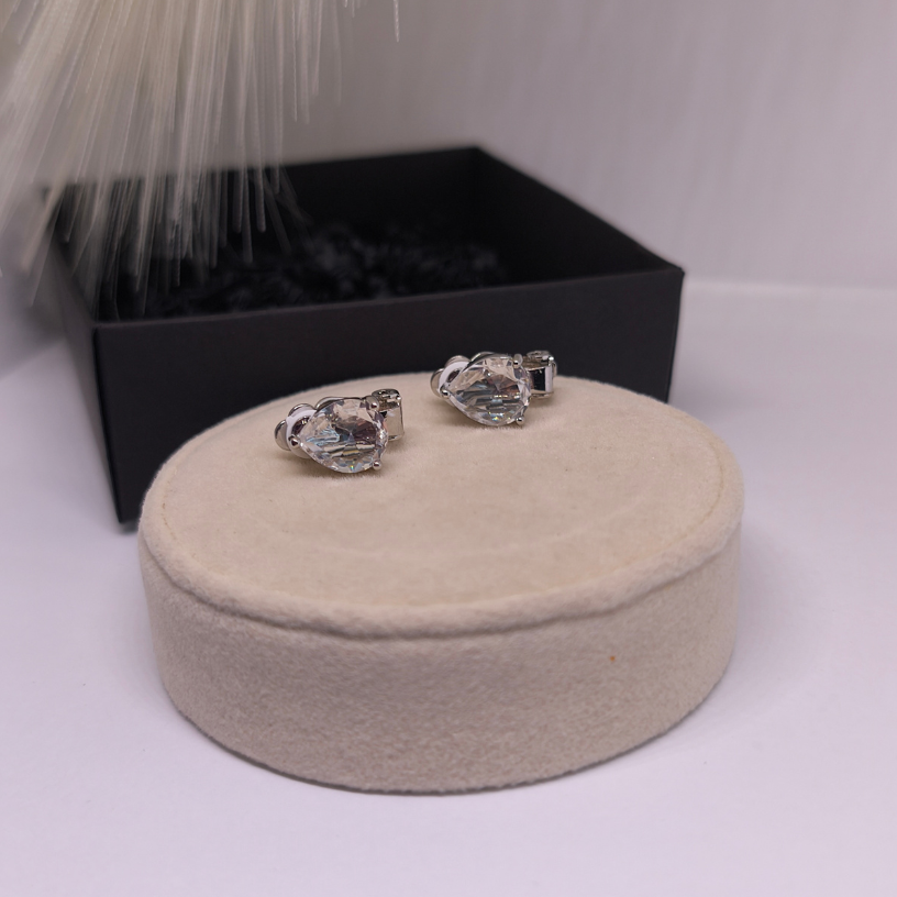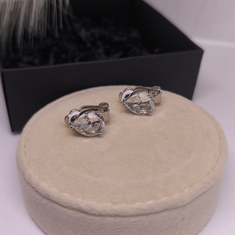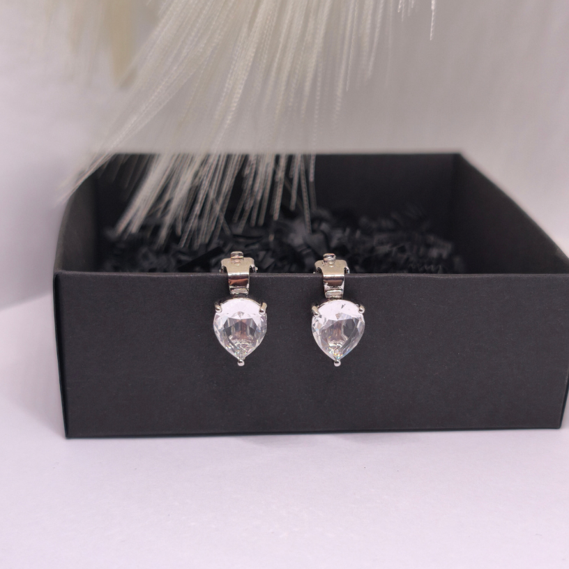 Caurspīdīgais, gaismu skaisti lauzošais akmens smalki spīd kustoties, piešķirot auskariem tīrības un greznības iespaidu. Piliena forma izceļ sievišķību, bet sudraba krāsas klipšu pamatne nodrošina elegantu un kārtīgu izskatu. 💎