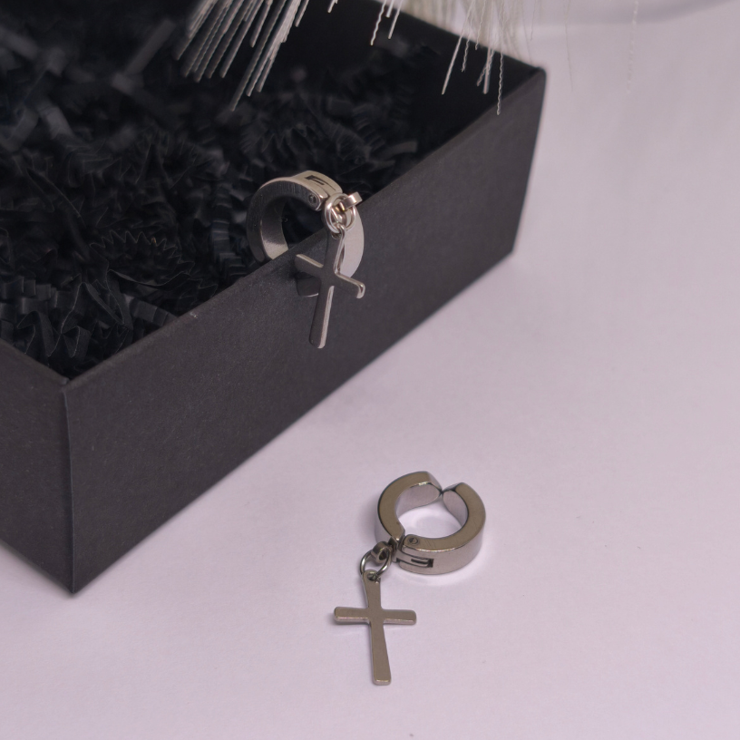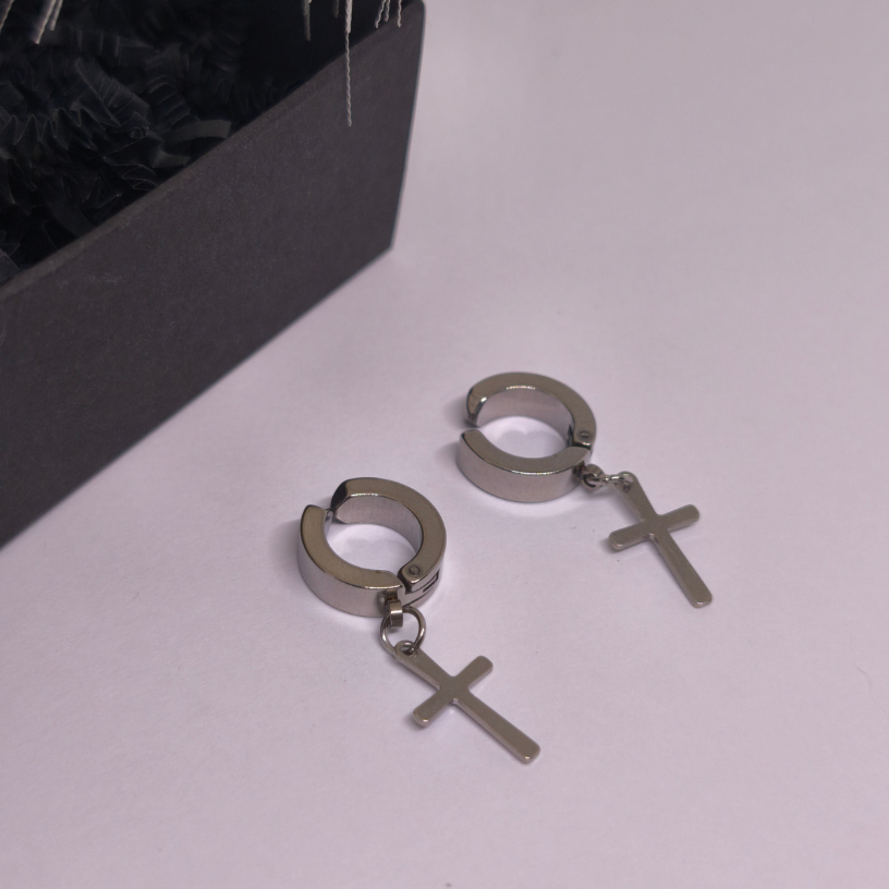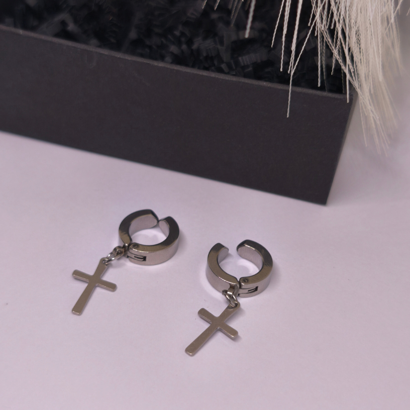 Klipsi „Krustu akcents“ – minimālistisks un universāls risinājums, kad vēlaties krusta formas piekariņu bez ausu caurduršanas. ✨ Gredzena formas klipsi cieši, bet ērti pieguļ pie auss, un sudraba krāsas virsma piešķir tīru, modernu izskatu. Piemērots gan sievietēm, gan vīriešiem – no street līdz smart-casual stilam. 🖤