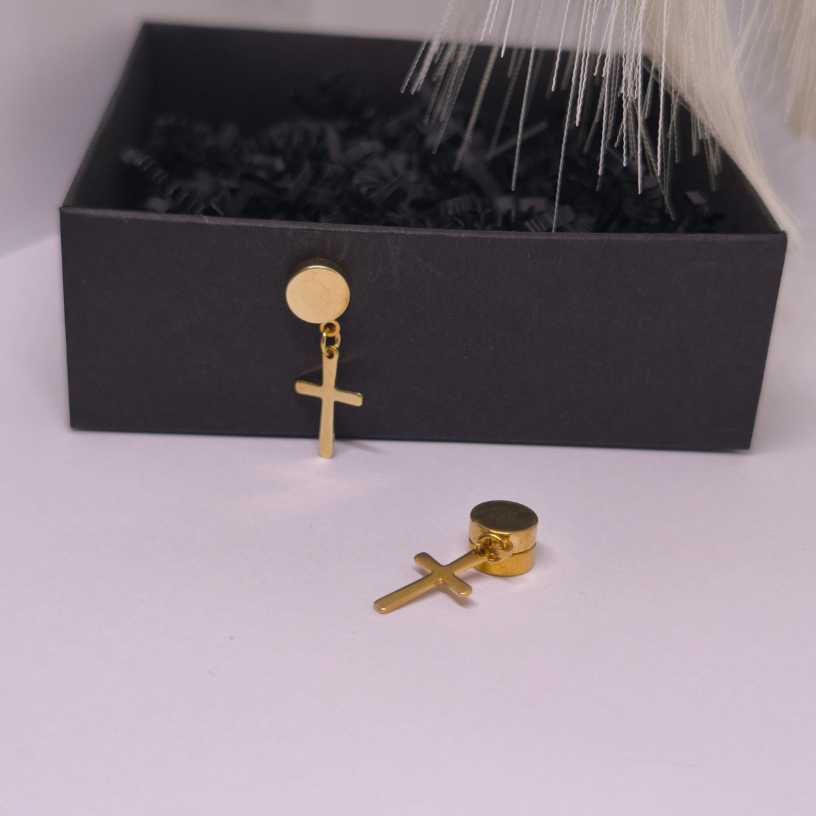 Magnētiskās auskari „Gaismas zīme“ – spilgts un elegants akcents, kas piešķir tēlam siltu zelta spīdumu bez ausu caurduršanas. ✨ Apaļa, gluda pamatne un kārtīgs krusta piekariņš rada smalku šarmu, bet stiprs magnēts nodrošina ērtu un drošu valkāšanu visas dienas garumā. 🧲