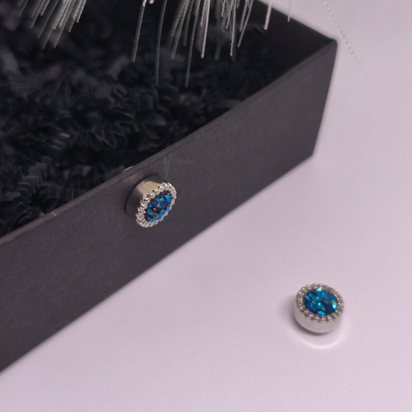 Magnētiskās auskari „Okeāna gredzens“ – svaigā okeāna toņa šarms bez ausu caurduršanas. 🌊 Sudraba krāsas korpusā ievietots zilais, mirdzošais centrs, ko apņem smalks kristālu vainags – šī kombinācija skaisti uztver gaismu un akcentē sejas vaibstus. Magnētiskais aizdare ļauj uzvilkt sekundes laikā, ērti un bez sāpēm. 🧲