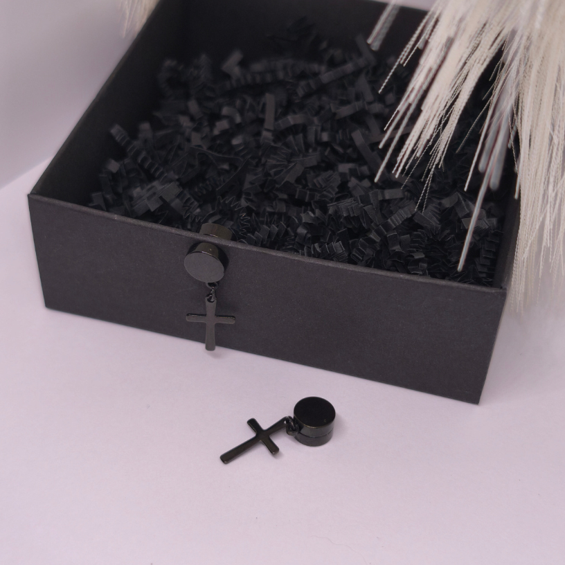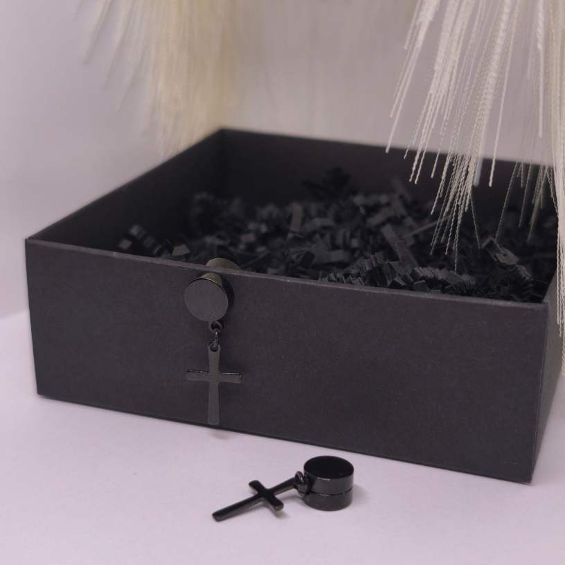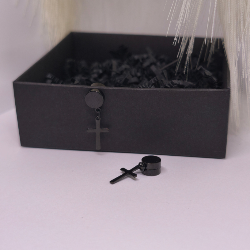 Magnētiskās auskari „Tumsas zīme“ – moderns melns akcents, kas piešķir izskatam spilgtu raksturu bez ausu caurduršanas. 🖤 Krusta formas piekariņš smalki šūpojas kustībā, un spēcīgs magnēts nodrošina ērtu un drošu nēsāšanu visu dienu.