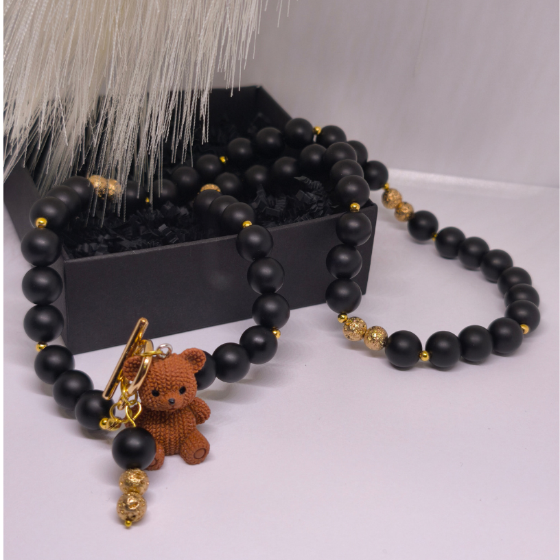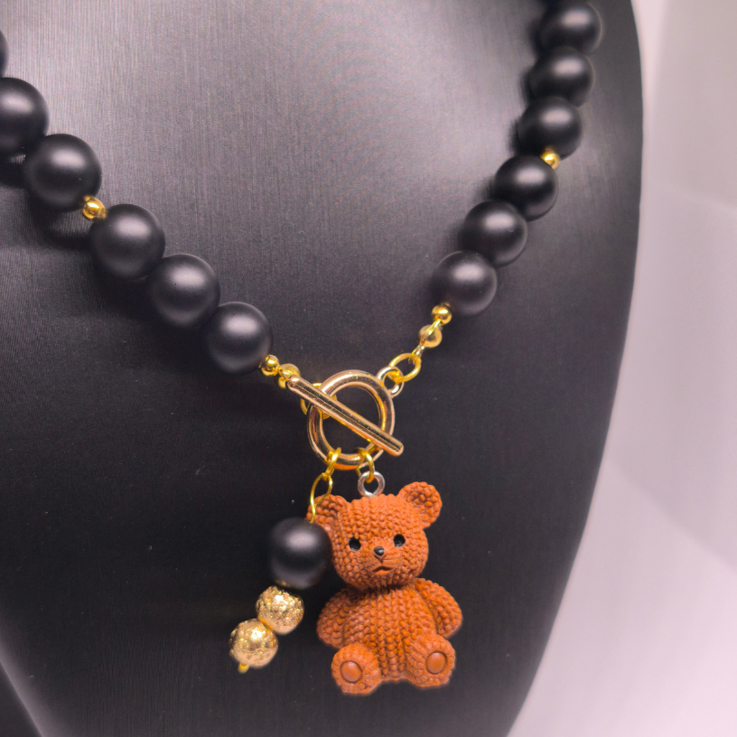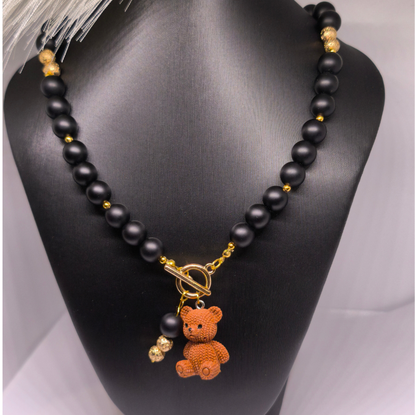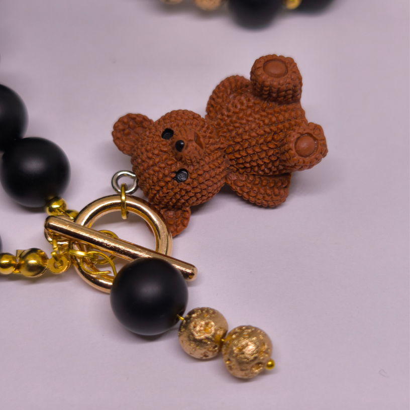 Atklājiet rotu, kurā saplūst dabas enerģija un izsmalcināts dizains. ✨ „Lācīša elegance“ – tas ir rokām darināts kaklarota, kas izgatavots no dabiskiem šungīta pērlītēm, papildināts ar zelta krāsas detaļām un mīļu lāča piekariņu.