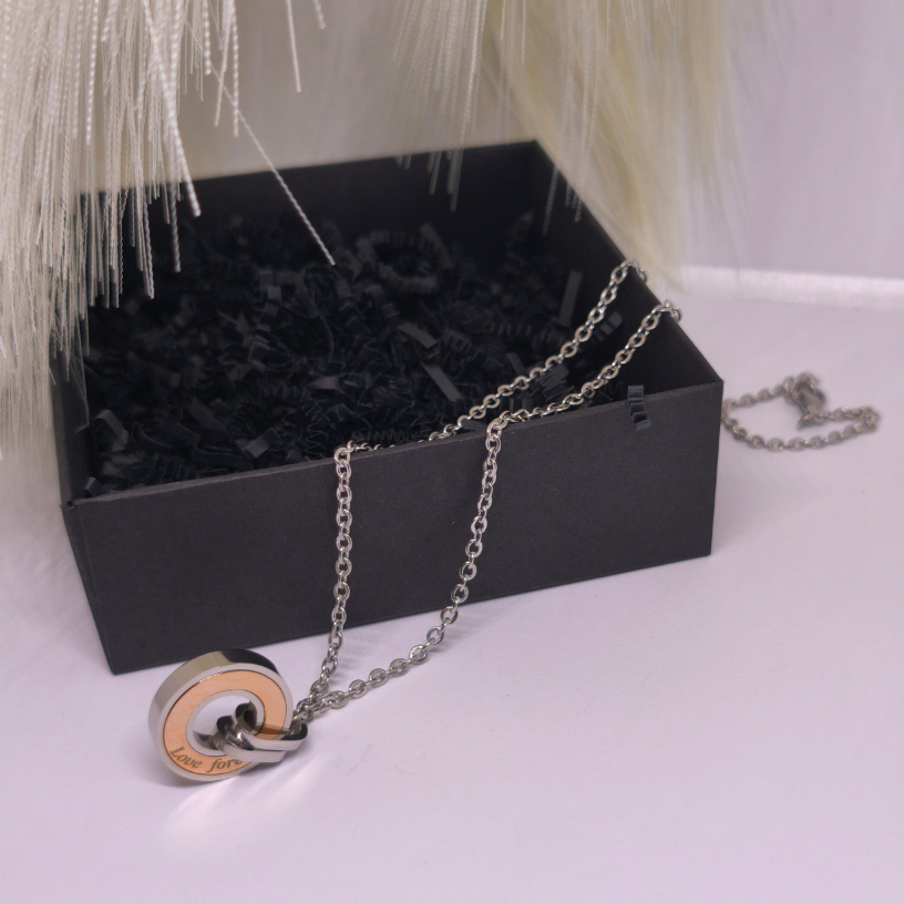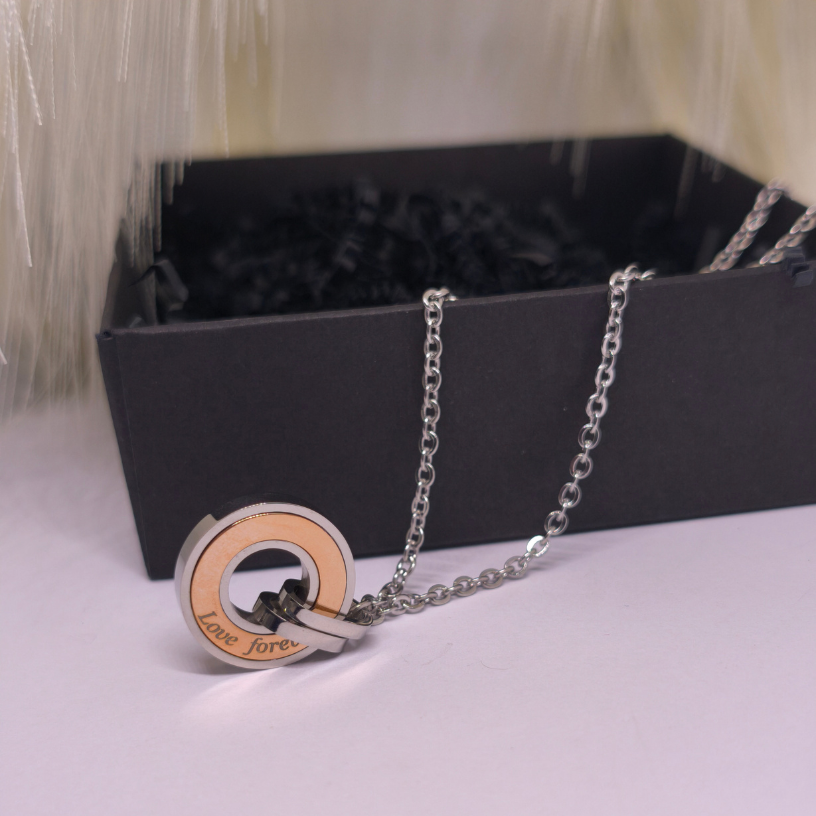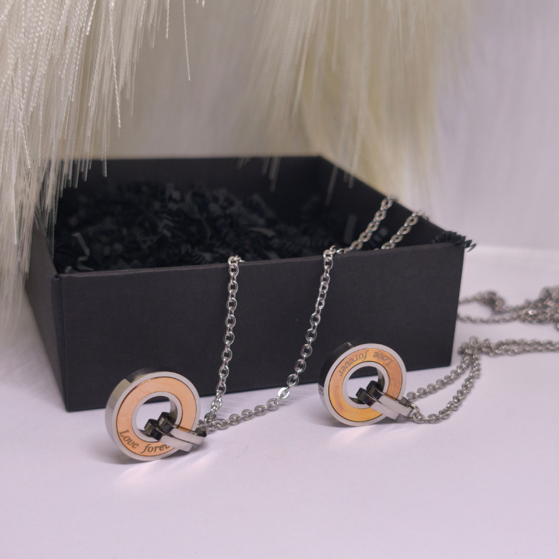 Šis komplekts sastāv no diviem viens otru papildinošiem kuloniem, savienotiem ar smalku iegravējumu „Love Forever“, kas nozīmē „Mīlestība mūžīgi“ 💍.