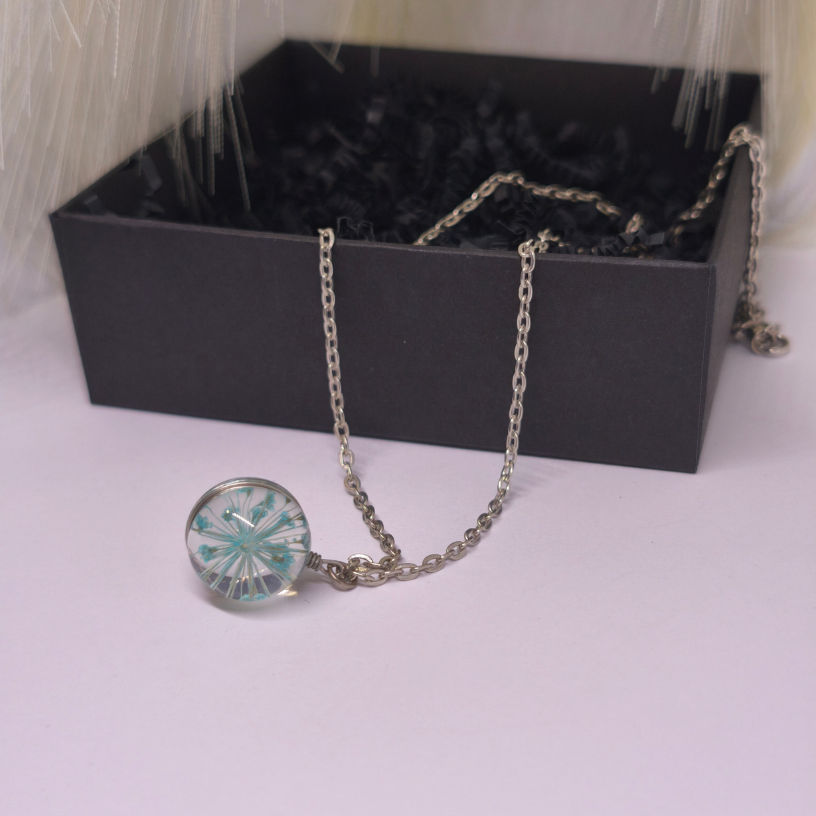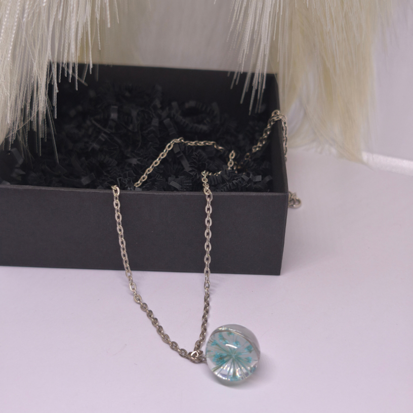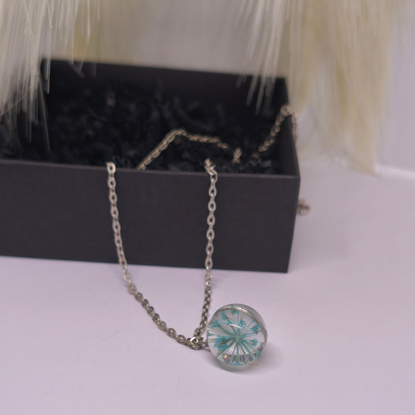 Caurspīdīgs kulons ar maigi zilas krāsas ziedu atgādina vējā nestu ziedu – trauslu, bet pilnu dzīvības un miera 🌬️🌸.