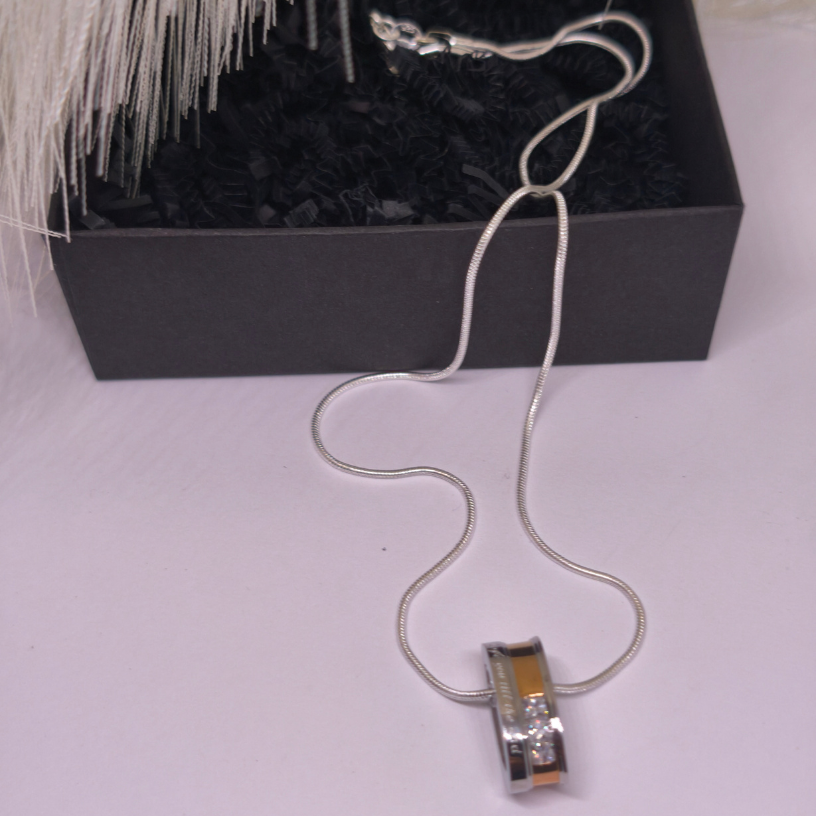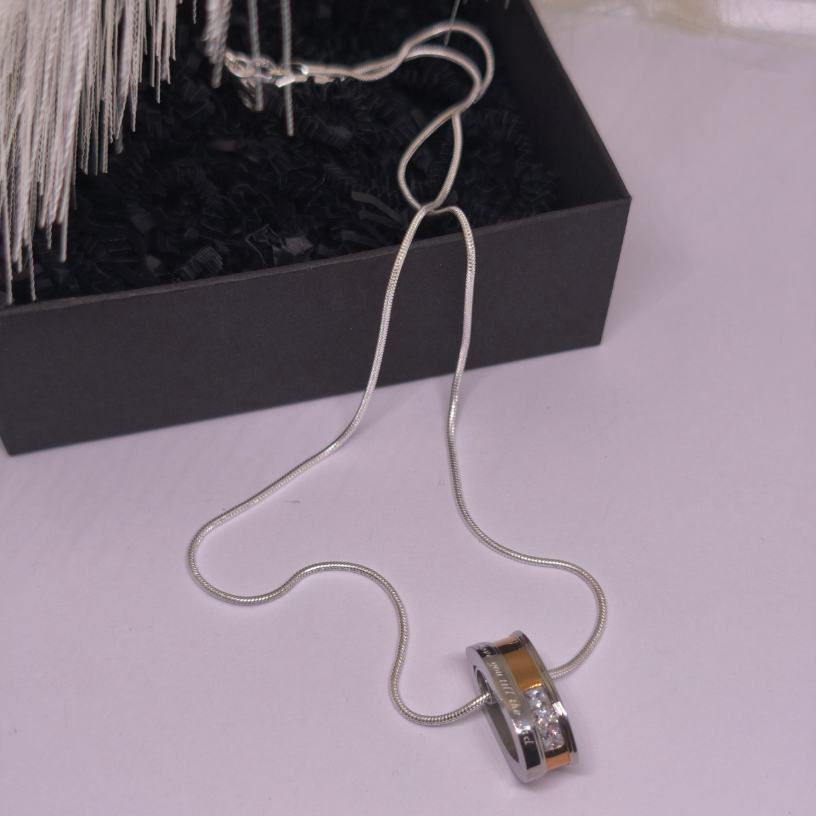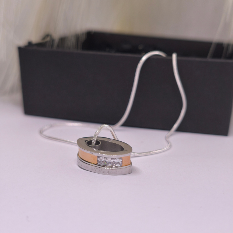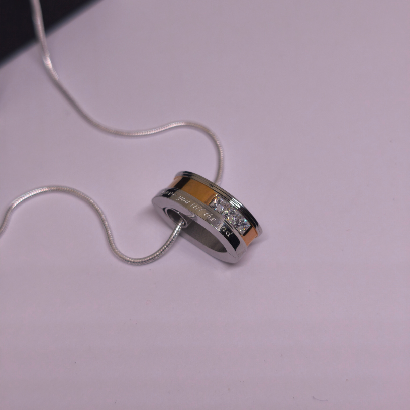💛 Kaklarota „Zelta solījums“ – tas ir smalks stila un jūtu apvienojums, kas iemieso mūžīgas mīlestības un uzticības simbolu 💍. Uz elegantas sudraba ķēdītes karājas piekariņš, kas ir gravēts ar frāzi “Love you till the end”, rotāts ar zelta akcentu un maigi mirdzošiem kristāliem, kas smalki atspoguļo gaismu un piesaista skatienu ✨.