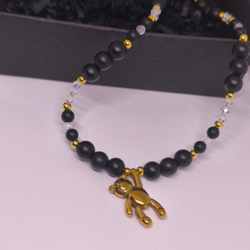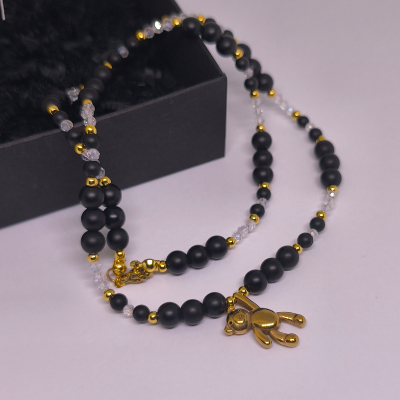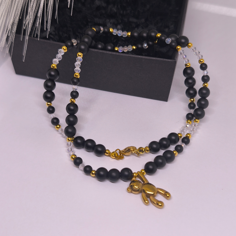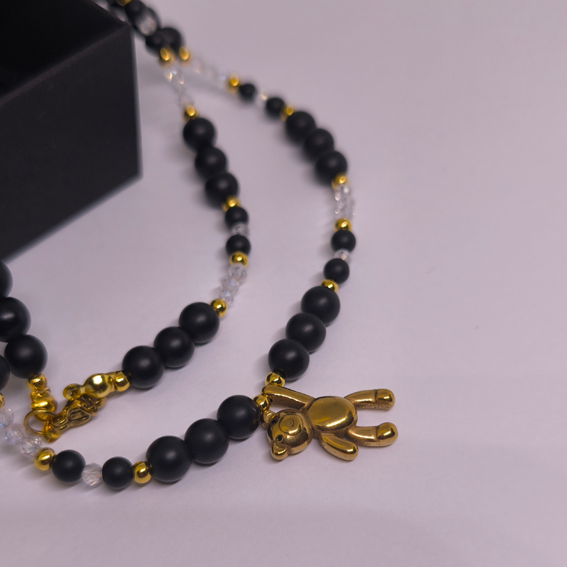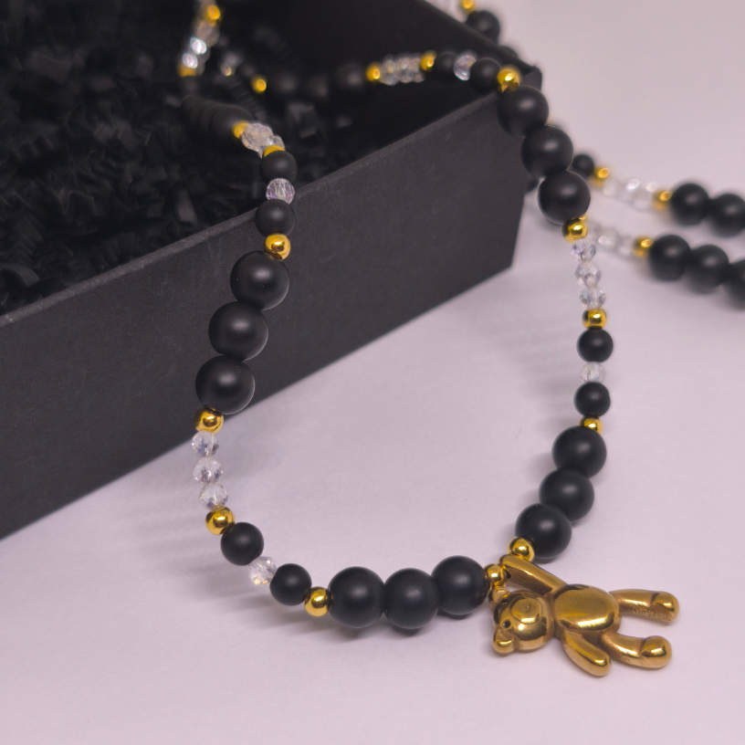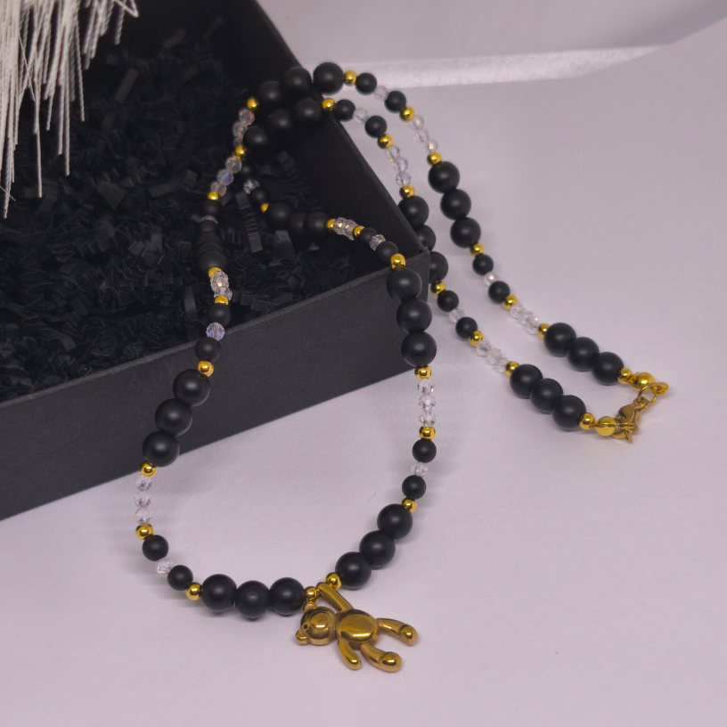 Kaklarotas centrā – zelta krāsas lācīša piekariņš, kas simbolizē siltumu, drošību un mājīgumu. Tas ir lieliska izvēle gan jauneklīgam, gan elegantam stilam. Lācītis piešķir kaklarotai rotaļīgumu, bet saglabā estētisko līdzsvaru.