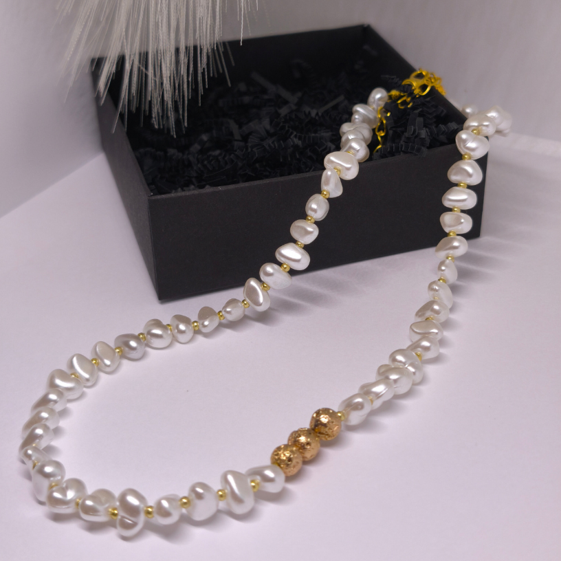 Zelta lavas pērlītes simbolizē spēku, enerģiju un saules siltumu ☀️, savukārt pērlīšu spīdums – sievišķību, tīrību un iekšējo harmoniju 🤍. Šis aksesuārs lieliski sader ar dažādiem apģērbu stiliem – no klasiskā līdz modernajam, piešķirot smalku mirdzumu katram tērpam.