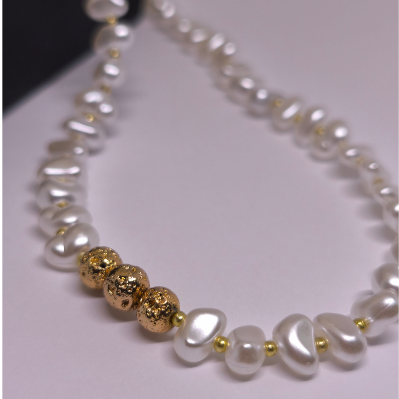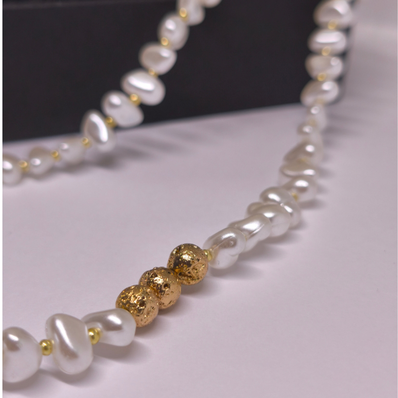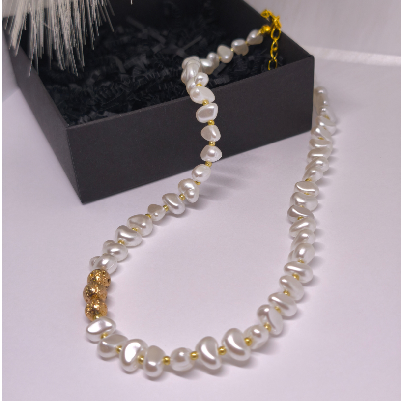 Atklājiet gaismas, miera un elegances harmoniju ar rokām darināto rokassprādzi „Zelta pieskāriens“. Šis izsmalcinātais aksesuārs ir veidots no zelta krāsas lavas pērlītēm un maigi spīdošiem pērlīšiem, kas kopā rada greznu, bet vienlaikus mājīgu tēlu 🌼.