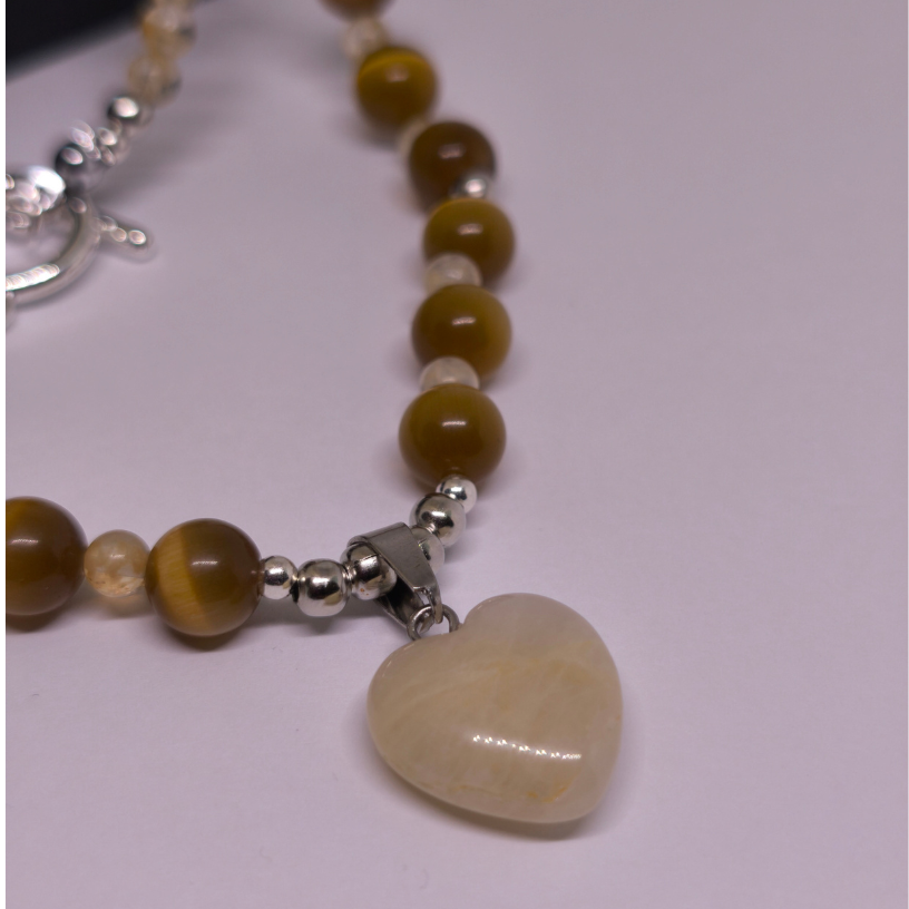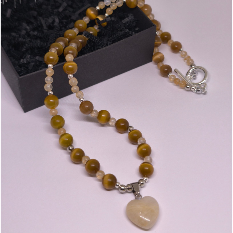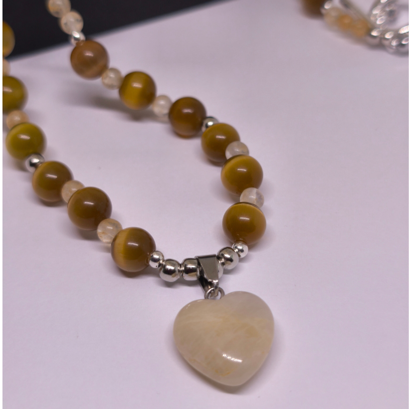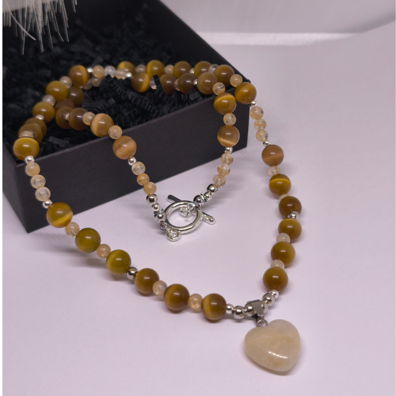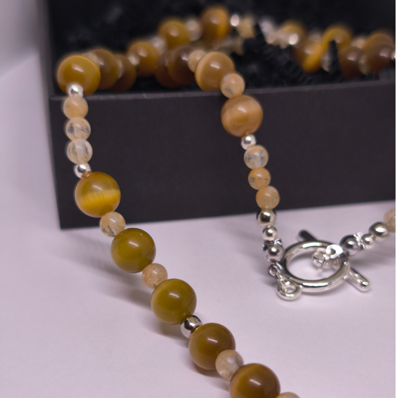 Ļaujiet gaismai spīdēt kopā ar jums – šī unikālā roku darinātā kaklarota „Saules mirdzums“ ir veidota no dabīgiem kaķa acs un rutila kvarca pērlītēm, kuru siltie toņi atgādina saules gaismu un iekšējo mieru 🌼.