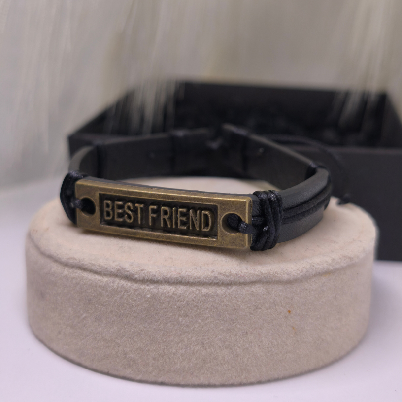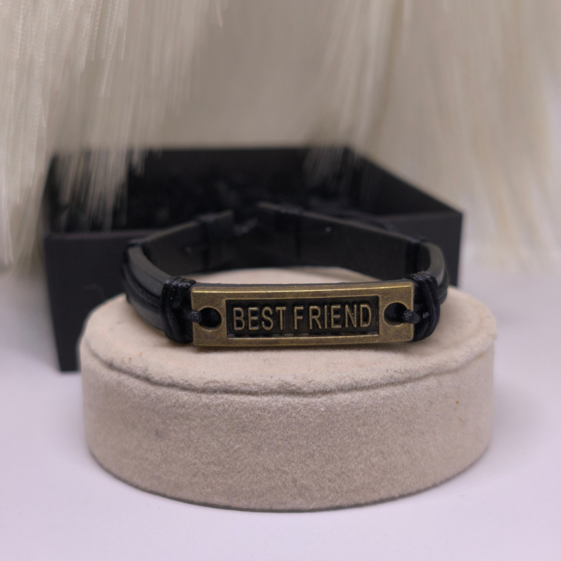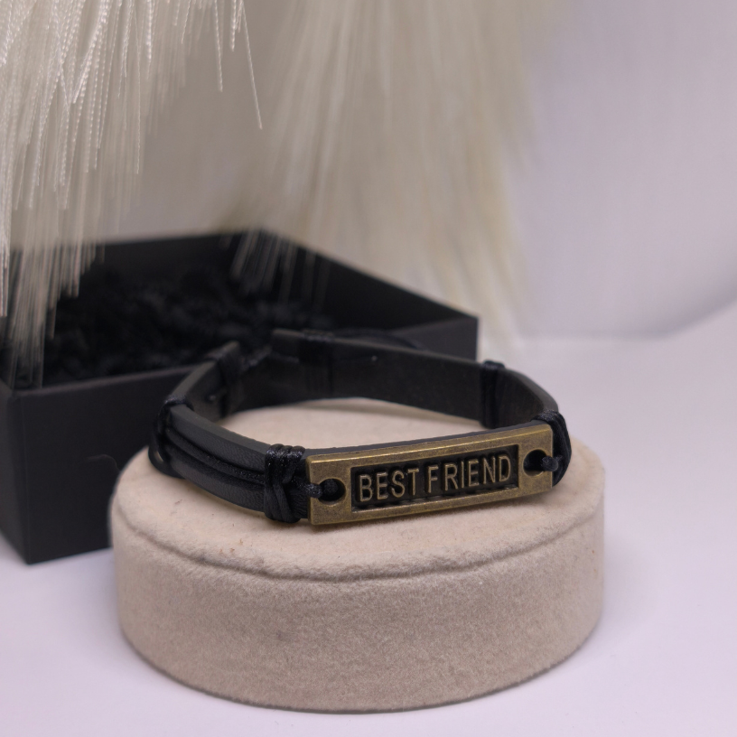 Izgatavota no melnas ādas imitācijas un rotāta ar senināta metāla plāksnīti ar uzrakstu „Best Friend“, šī rokassprādze izceļas gan ar nozīmīgu dizainu, gan universālu stilu 🌿.