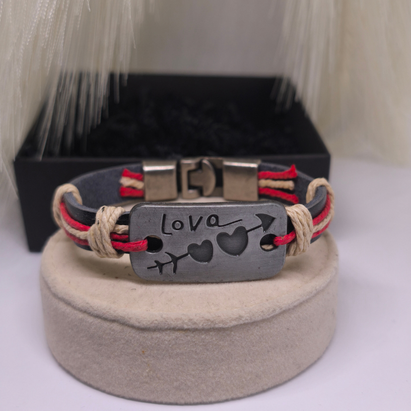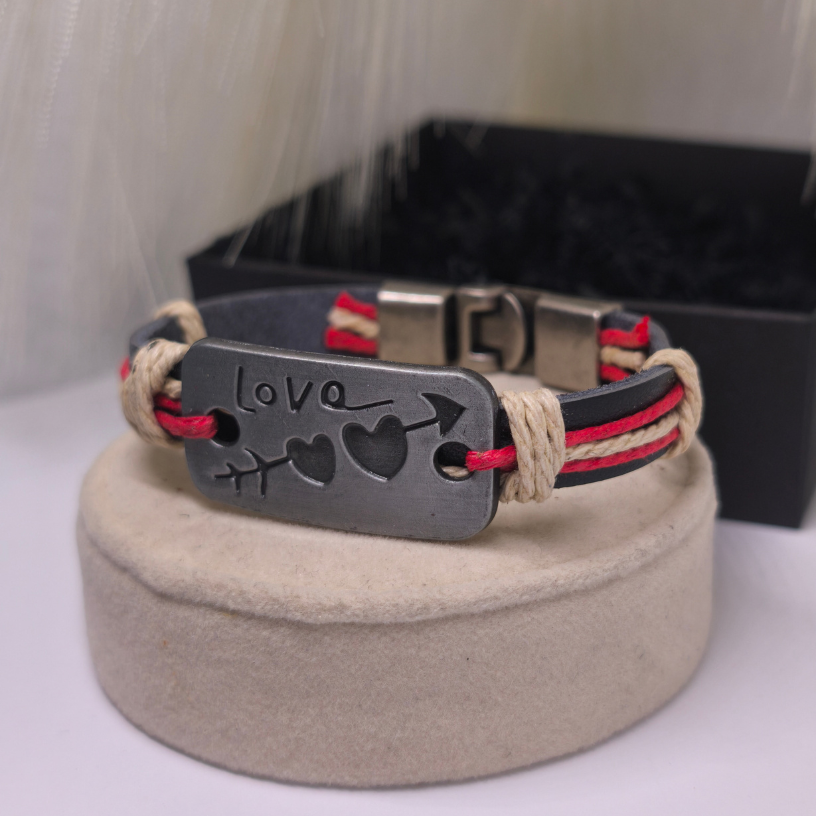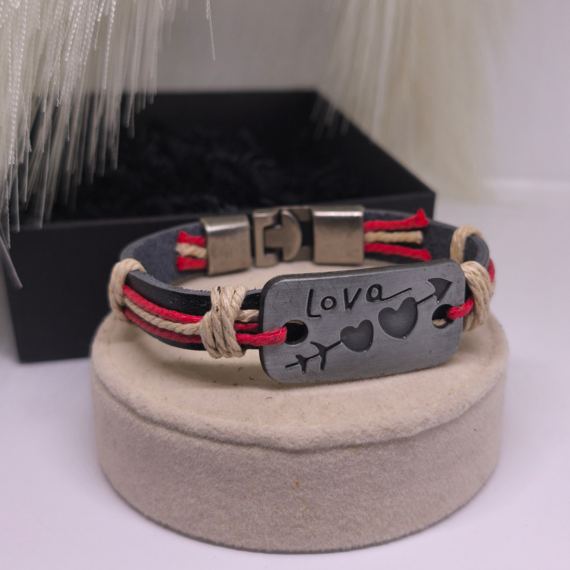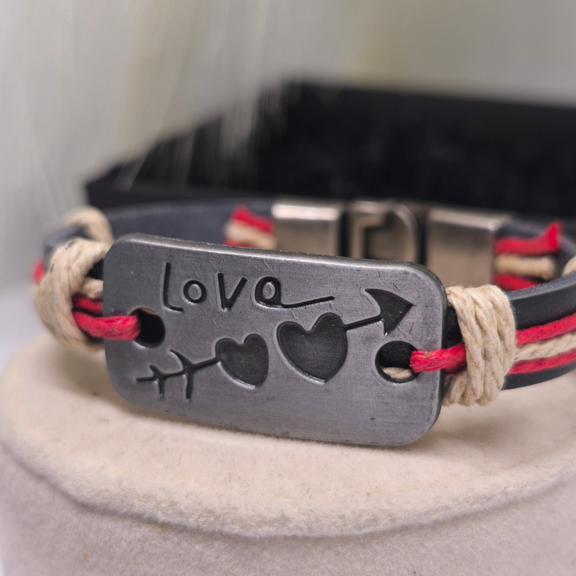 💖 Rokassprādze „Sirdžu ceļš“ – tas ir mīlestības simbols, kas apvieno stilu, siltumu un emocijas. Uz stipras siksnas no dabas ādas un diegiem iekļauta metāla plāksnīte ar gravējumu „Love“ un sirsniņām, kas simbolizē ceļojumu caur dzīvi kopā 💞.
