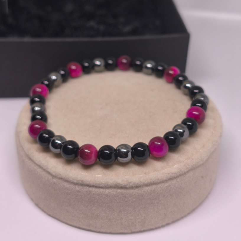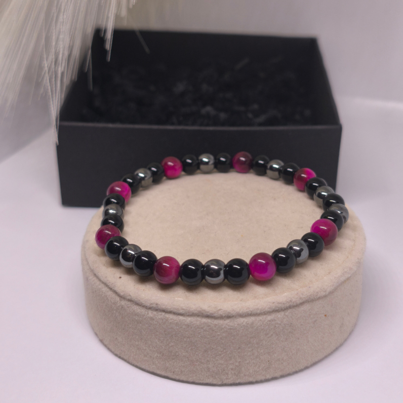 Rokassprādzes pamatu veido melnie krelles, kas simbolizē iekšējo mieru, stabilitāti un pašapziņu. Tumšā krāsa piešķir rokassprādzei universālumu un ļauj to kombinēt gan ar ikdienas, gan elegantāku apģērbu.