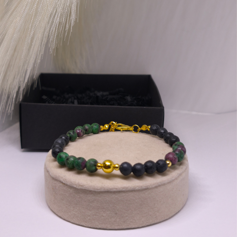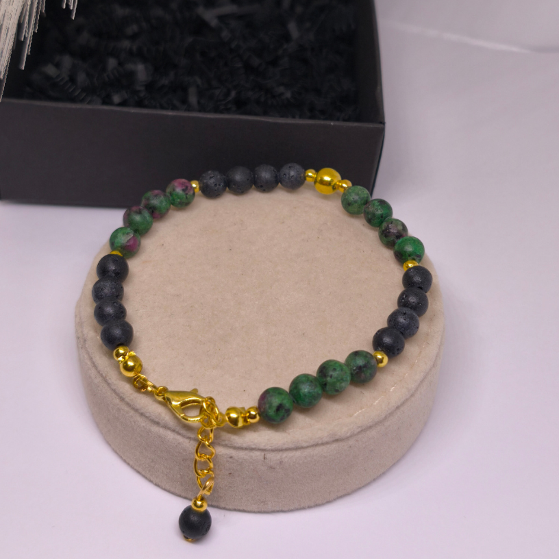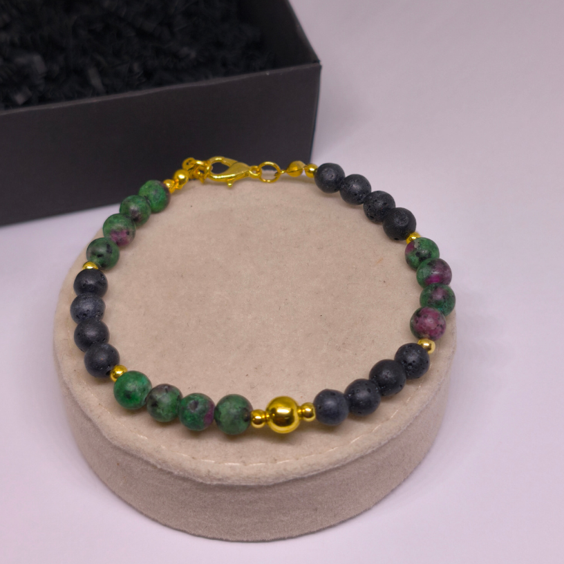 Zoisīts ar rubīnu izceļas ar zaļu un rozā toņu spēli, kas piešķir rokassprādzei dzīvīgumu. Lavas akmeņi maigi sabalansē krāsas, radot elegantu kontrastu.