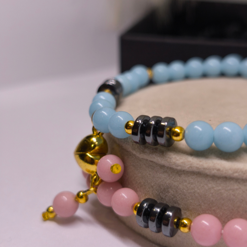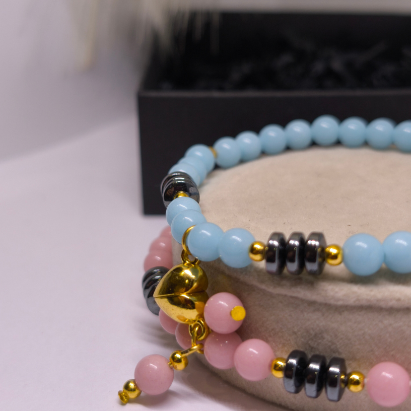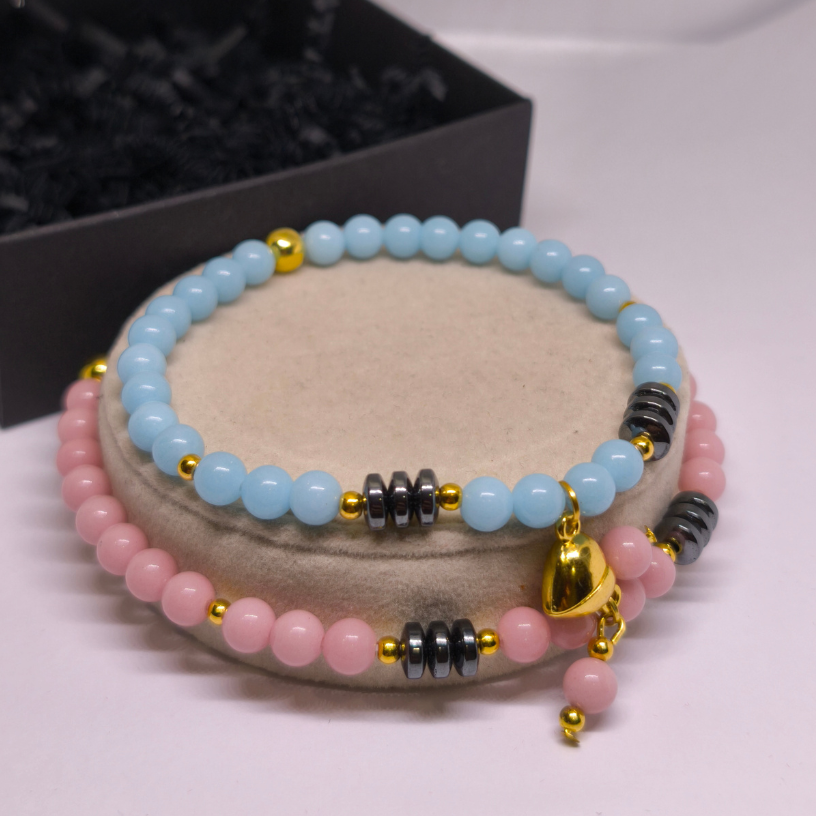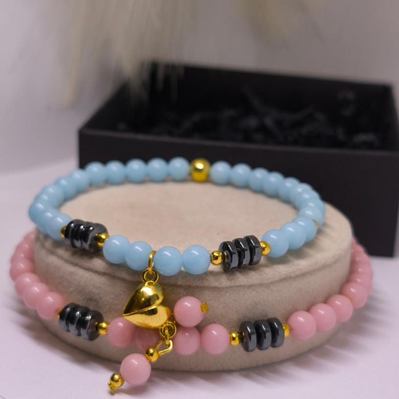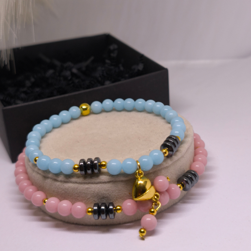 Šīs rokassprādzes ir izgatavotas no tumsā spīdošām pērlītēm, kas ne tikai sniedz izcilu vizuālu efektu, bet arī simbolizē pastāvīgu divu cilvēku saikni. Komplektu papildina zeltainas detaļas un magnētiski sirds formas piekariņi, kas savienojas savā starpā – kā divas sirdis, kas atradušas viena otru. 💛🔗