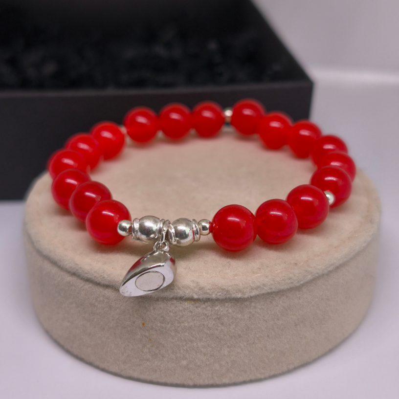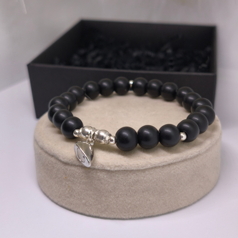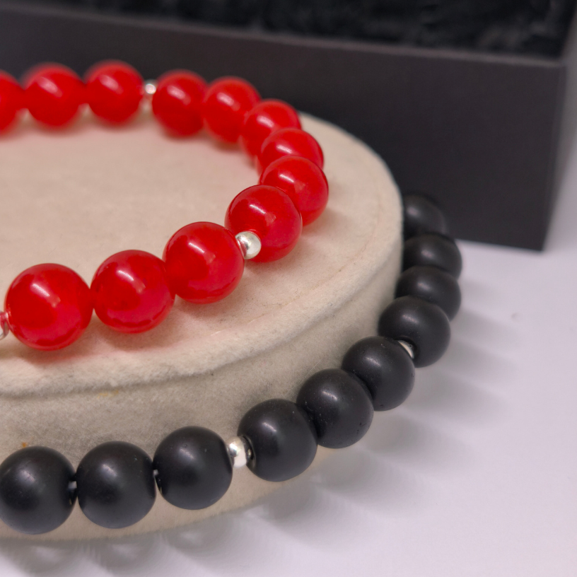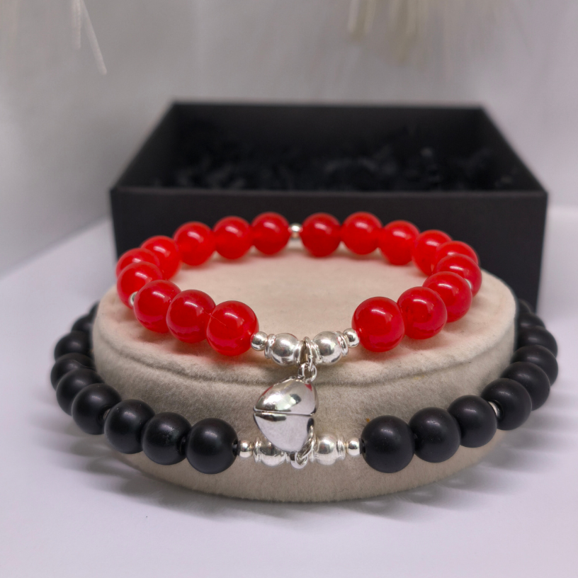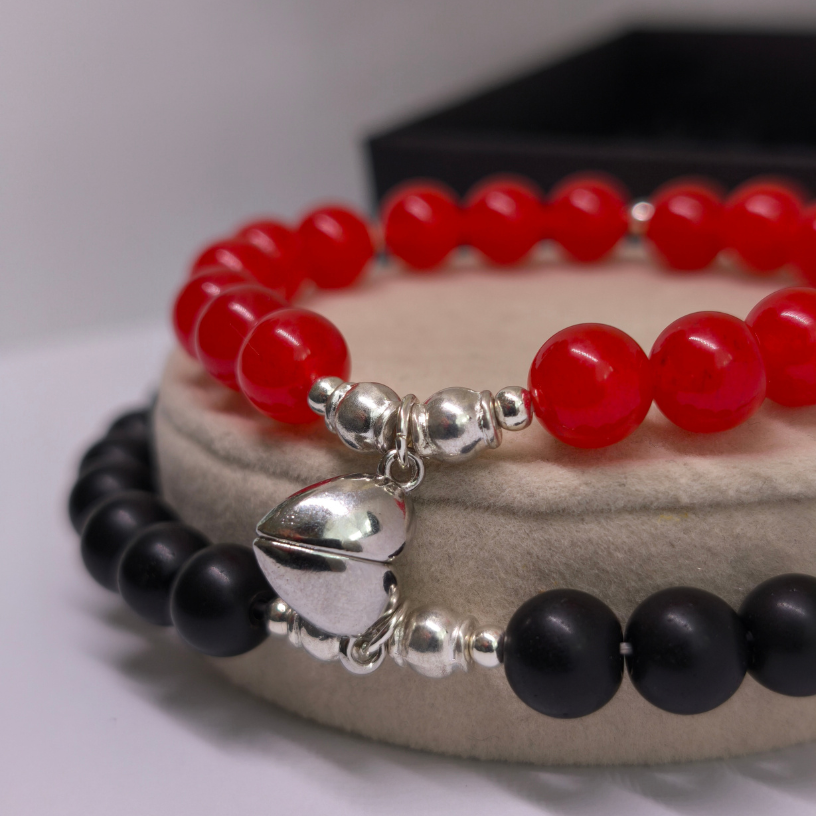 💞 Rokassprādžu komplekts pārim „Mīlestības pievilkšanās“ – izsmalcinātas, roku darinātas rokassprādzes, radītas diviem iemīlējušiem cilvēkiem. Sarkanā rokassprādze izgatavota no dabīgā halcedona akmens, kas simbolizē kaisli, enerģiju un sirds spēku, savukārt melnā rokassprādze – no šungīta, kas pazīstams kā aizsardzības un miera akmens.