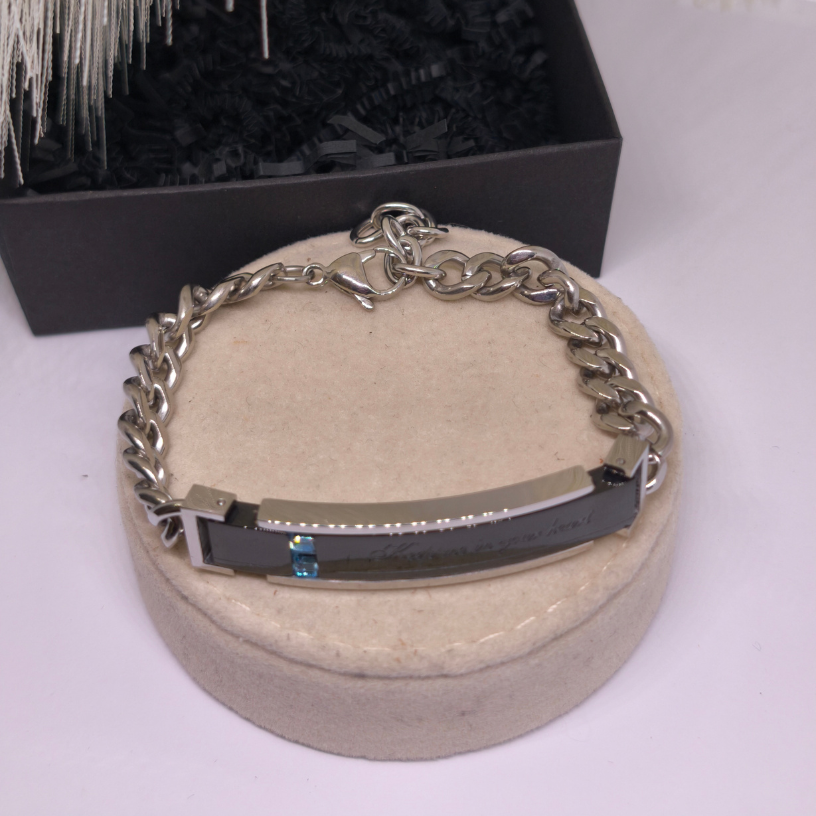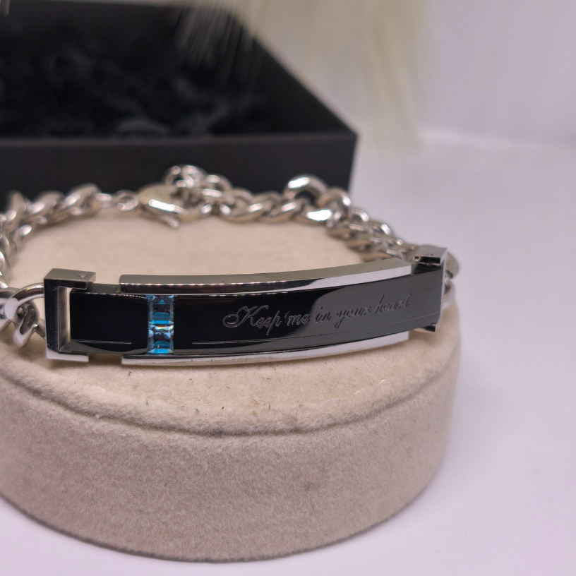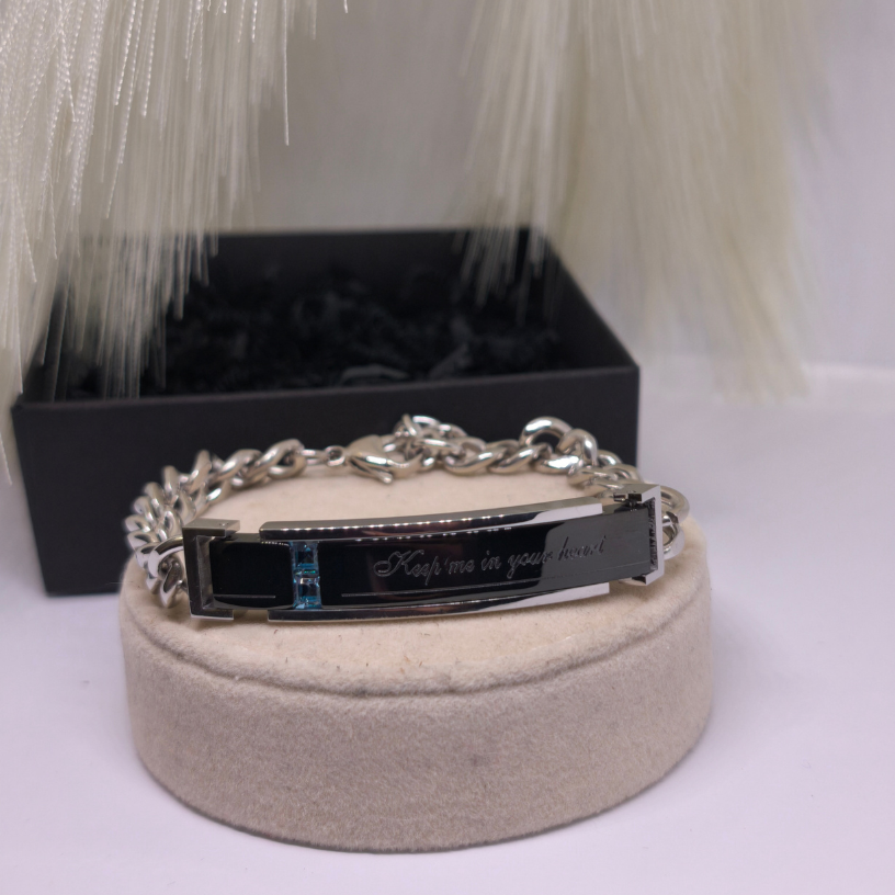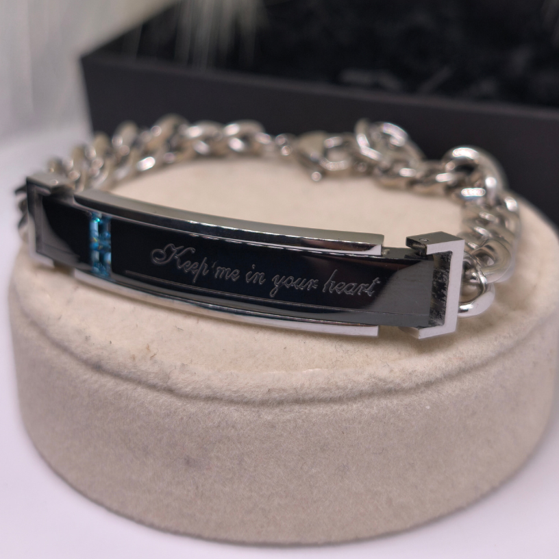 Izgatavota no augstas kvalitātes nerūsējošā tērauda, šī rokassprādze izceļas ar savu modernu dizainu – spīdīgs melnā un sudraba toņa savienojums, smalks uzraksts „Keep me in your heart“ un zils akcents rada izcilu vizuālo līdzsvaru ✨.