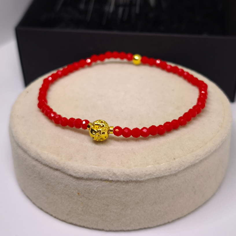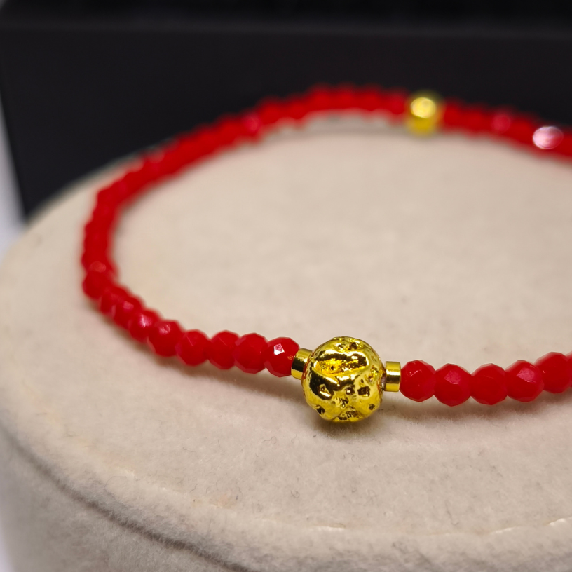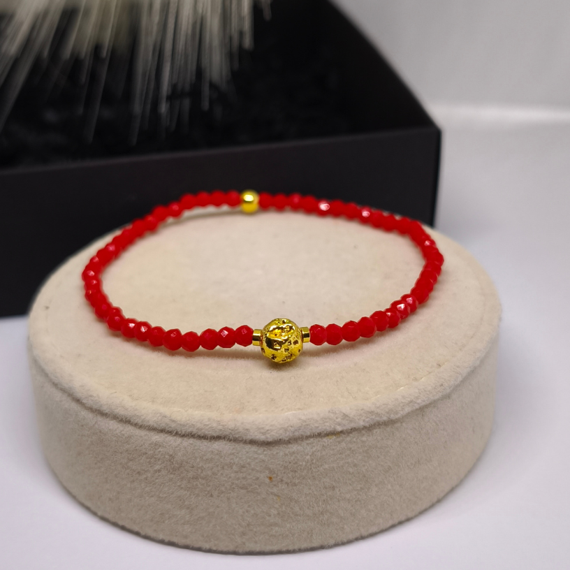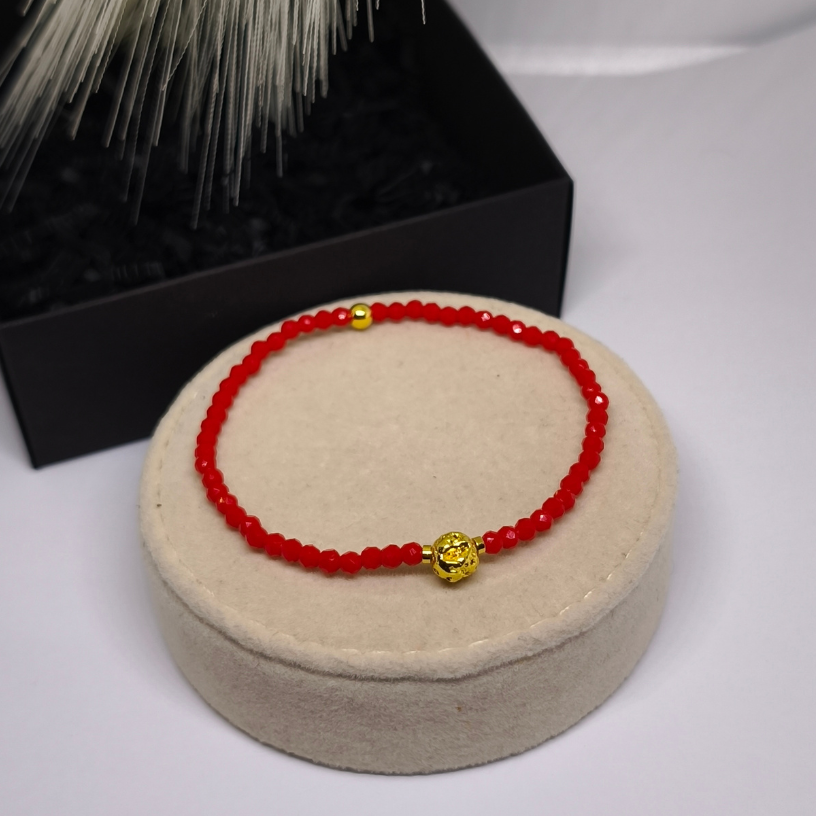 Koši sarkanie stikla kristālu krelles piešķir rokassprādzei izcilību, enerģiju un dzīvīgumu, bet zeltainas krāsas lavas krelles kļūst par galveno akcentu, simbolizējot spēku, stabilitāti un labu enerģiju 🌟.