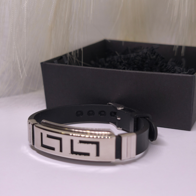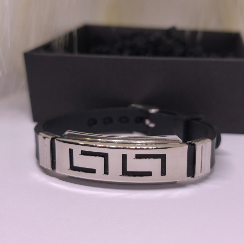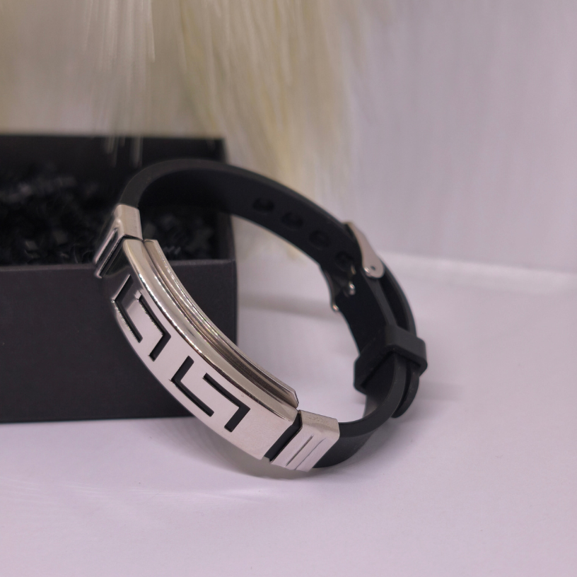 Šī rokassprādze ir izgatavota no augstas kvalitātes melnas gumijas un nerūsējošā tērauda, tāpēc tā ir ne tikai vizuāli pievilcīga, bet arī ilgmūžīga ⚙️.